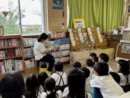 図書の時間で読み聞かせをしてもらっています。みんなでお話に夢中になっています。