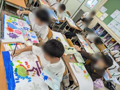 図工では「まぼろしの花」を描いています。オリジナリティあふれる不思議な花がたくさん生まれています。
