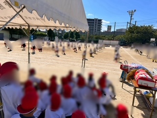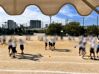 1年生と2年生で運動会の団体演技の見せ合いをしました。初めてたくさんの人に見られてドキドキしたと思います。