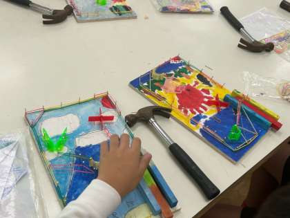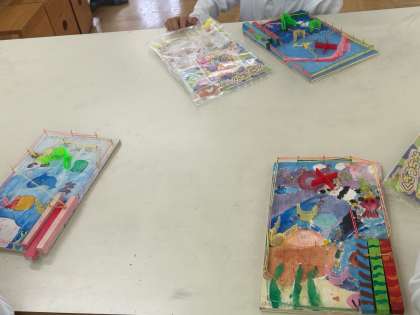 ビー玉の軌道を確かめながら、釘や輪ゴムなどの部品を使ってオリジナルのコースを作っています♪