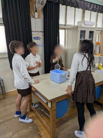 理科ではあたためた空気のかさがどう変化するのか実験をしました。目印となるゼリーの動きを観察し、空気のかさが増えていることに気づいていました。