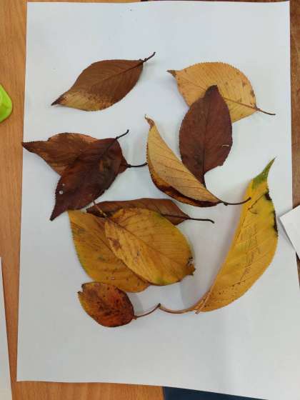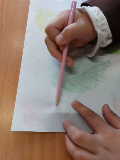秋の落ち葉を使って、図画工作科で葉っぱの模様のこすりだしをしました。