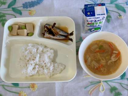 いわしのしょうが煮は、切りこんぶはさっと洗い、ひたる程度の水につけます。水(こんぶのつけ汁も使用)、こんぶ、砂糖、米酢、こいくちしょうゆ、料理酒を合わせます。いわしはミニバットに入れ、調味液、せん切りにしたしょうがを加え、焼き物機、蒸し焼きモードで煮ます。1人2尾ずつです。やわらかく煮こまれているので、骨もまるごと食べられて、栄養満点です!切りこんぶとせん切りしょうがが、いい仕事をしてくれます。
