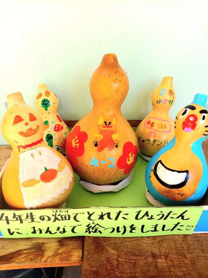 4年生の畑でとれたひょうたんに絵付けをしたものを、ピロティに飾りました。