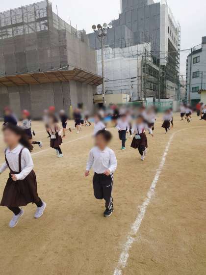 3時間目終了後の休み時間に、大運動場のトラック(1年生は少し小さめ)を走ります。