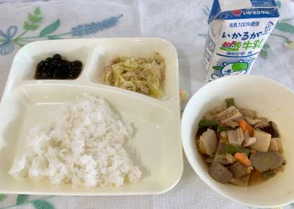 ・筑前煮 ・ツナとキャベツのごまいため ・黒豆の煮もの ・ごはん ・牛乳でした!