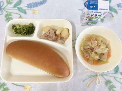 鶏肉はにんにく、塩、こしょう、こいくちしょうゆ、オリーブ油で下味をつけ、じゃがいもを加えて混ぜ合わせます。焼き物機で焼いたらできあがりです。にんにくの香りがきいて、美味しいです。