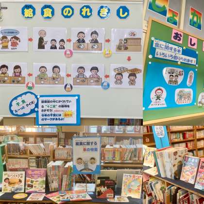今週は学校給食週間ということで、図書室の司書の先生が、給食や食べ物の本を集めた給食週間コーナーをつくってくださいました。給食の歴史が一目でわかる掲示もしてくれました。図書室にどんどん来てくださいね。