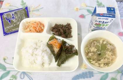 本日は、学校給食献立コンクール優秀賞献立でした!平野区平野北中学校の生徒が考えた献立です。ねらいは、「キンパを給食で食べたいと考えました。自分で手巻きするので、楽しく食べられます。」だそうです。のりも6枚入っているので、ねらい通り、こども達は思い思いののり巻きを作って、楽しく美味しく食べられたようです☆