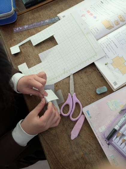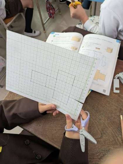 4年生の算数では立方体と直方体を学習しています。教科書を参考に立方体の展開図を描き、立方体を組み立てていきます。