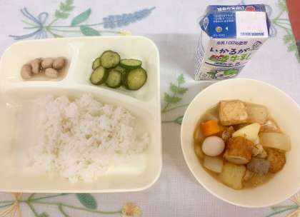 関東煮は、かんとうに、かんとだきと読みます。おでんのことを関西では、そう呼んでいます。鶏肉、うずら卵、ちくわ、じゃがいも、こんにゃく、あつあげ、だいこん、にんじんと具だくさんです。うずら卵除去食対応献立です。卵アレルギーの児童もみんなと同じ献立を食べることができます。今日も寒かったので、あったかいおでんの登場に、みんな大喜びでした!