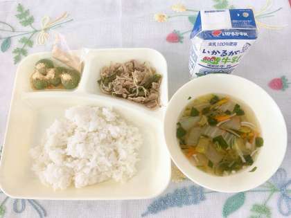 なんと、3 14種類でした!!ごはん、牛乳、豚肉、しょうが、ブラックマッペもやし、さんどまめ、はくさい、だいこん、にんじん、みつば、えのきたけ、よもぎだんご、きな粉です。たくさんの食材が使われている栄養満点の給食、本当にありがたいですね。