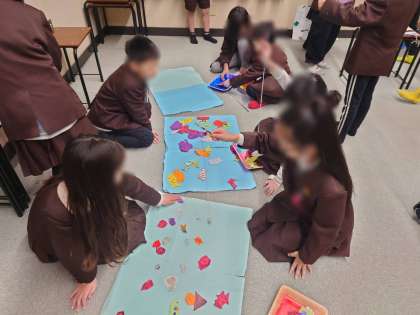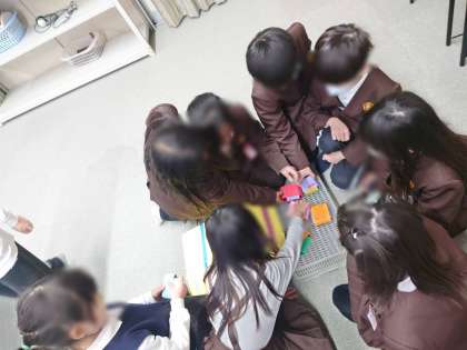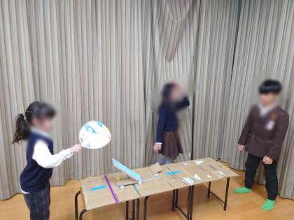 2年生が班ごとに工夫して作ったおもちゃ。遊び方の説明を聞いて、遊ばせてもらいました。