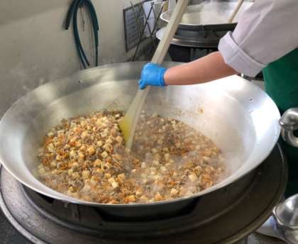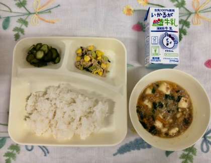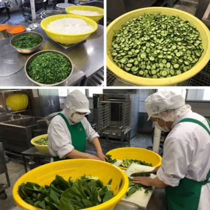 今日の給食は、野菜たっぷりメニューでした。たまねぎ、にんじん、にら、しょうが、にんにく、きゅうり、チンゲンサイ、コーンと1人当たり116グラムの野菜が使われていました。野菜の目標摂取量は、小学生が1日300グラム、大人が1日350グラムです。給食では、1日に必要な量の1/3の野菜を食べることができるように献立が考えられています。