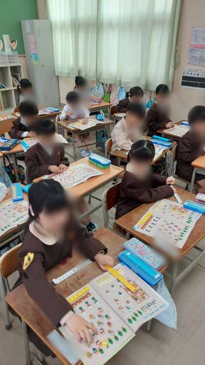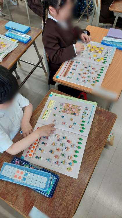 算数科の学習で、6から10の数について学習しています。この日は、ブロックを使って、同じ数の仲間集めをしました。