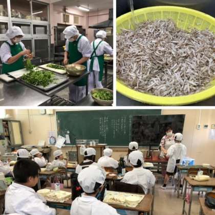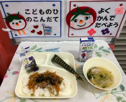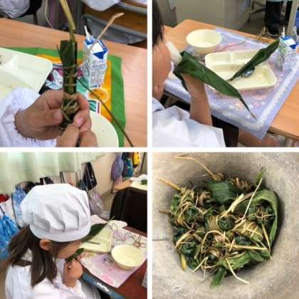 今日の給食は、『こどもの日の行事献立』でした。大阪市で登場するちまきは、一般に市販されているものよりも糖分を控えめにしています。1年生の教室では、先生から「ちまきを初めて食べる人?」という問いかけに、ほとんどの人が手をあげていました。初めて食べるちまきがどのような味なのか、様子をみながらゆっくりと一口ずつ食べていました。食べてみておいしかった人はおかわりもしていました。笹の葉をむいて食べる時に「バナナみたい!!」と言っている人もいました。4年生の教室をのぞいてみると、「めっちゃおいしいです!!」と感想を伝えてくれました。ちまきを食べ終わった後の笹の葉をきれいにまとめて返している学級もありました。