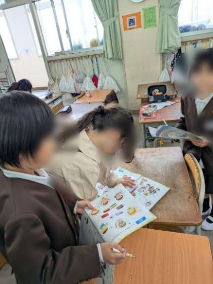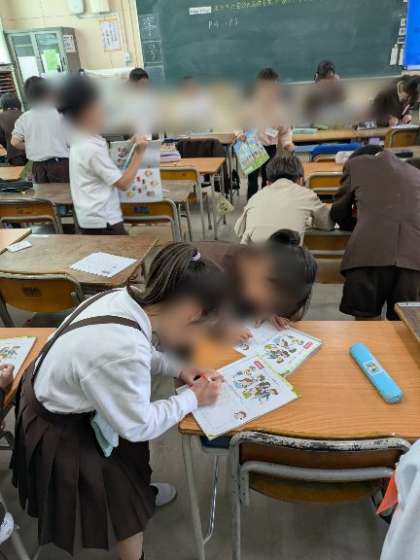 3年生では外国語活動の学習で挨拶をして、お互いの名前を言い合う活動をしました。「Hello.I'm○○.」など、自分の名前を英語で言い合い、聞き取った友だちの名前をたくさん書いていました。