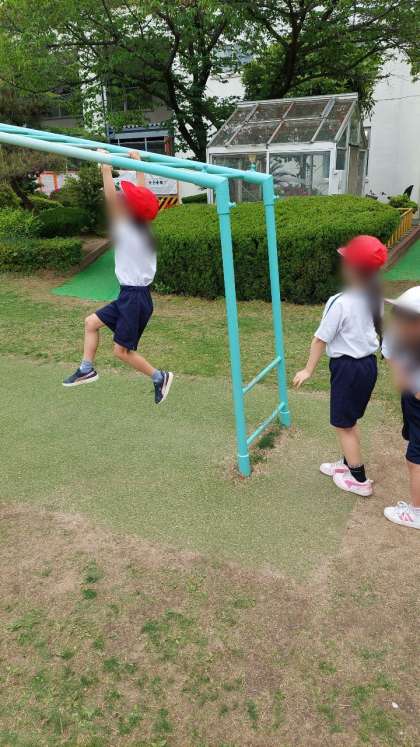 体育科の学習で、小運動場の時には遊具遊びをしています。この日は、鉄棒とうんていをしました。連続で逆上がりやうんていを最後までできる子がいたため、その姿を見てみんなも「すごい」「頑張れ!」など、素敵な言葉をたくさん言っていました。