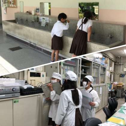 給食委員会の児童も毎日はりきって活動しています。給食室の前で元気よく身支度チェックをしたり、わかりやすく聞きやすく献立放送をしたりしています。給食委員会の児童の活躍が、身支度をしっかり整えよう、給食を味わって食べようという学校全体の給食時間を盛り上げています。