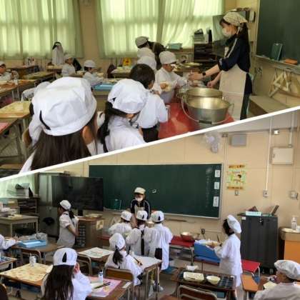 今日から5月の給食が始まりました。ホイコウローにはテンメンジャンが、あつあげにはトウバンジャンが使われていました。少しピリ辛の濃い味付けのメニューでしたが、どの学級もよく食べていました。ごはんがとてもよく進みました。1年生では、食べ終わった後の後片づけを一つ一つ確認しながら行っていました。お皿におかずの汁が残っていないか、ごはん粒を残さずに食べることができているか、牛乳パックの中に牛乳が残っていないかなど、確認しながらきれいに返すことを心がけていました。