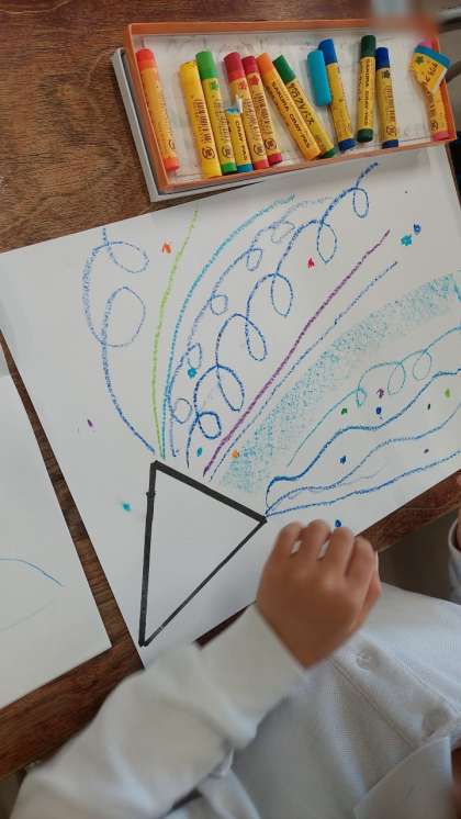 図画工作科では「クラッカー」を描いています。8種類の線の中から線を組み合わせて線を描いたり、記号を描いたりしています。どんな作品が完成するのか楽しみです。