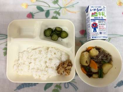 肉じゃがは、給食室の大きな釜を2つ使って作りました。3年生の教室では、肉じゃが、きゅうりの酢のもの、ごまかかいためと、どのおかずも大人気でおかわりの列ができていました。肉じゃがをおかわりした児童に理由を聞いてみると、「じゃがいもがホクホクでおいしい!!」と言っていました。煮崩れしないように、でもしっかりと味がしみるように考えながら、じゃがいもを煮る時間や調味料を入れるタイミングを調節しています。本校の児童にしっかりと料理のおいしさが伝わっていたのでうれしくなりました。