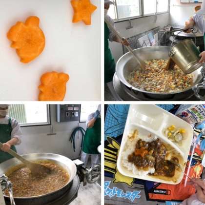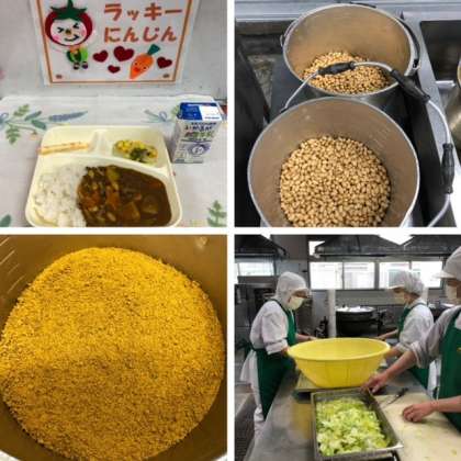 牛肉と大豆のカレーライスには、ラッキーにんじんが入っていました。給食調理員さんが『りす』と『星』の形を80個ほど作ってくれていました。レタスとコーンのサラダは、焼き物機で蒸しています。カレーライスは大人気で、どの学年の児童もあっという間に食べ終わっていました。ラッキーにんじんが入っていた児童は、「今の学年になってからこれで5個目を見つけた!!」「私はまだ1回しか見つけてない。」など、いろいろな話をしていました。