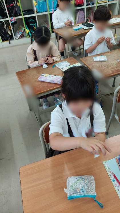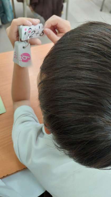 算数科の学習で、初めて計算カードを使いました。どんな風に計算カードを使うのかを聞いてから、一人で練習したり、ペアで問題を出しあったりしました。