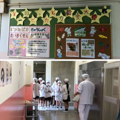 6月5日(木)は『第1回ピッカピカ給食大作戦』の日でした。食べ物を大切にする気持ちや給食を作ってくださっている人たちに感謝の気持ちをもつことなどの大切さを改めて考える取り組みです。給食を取りにきた時に給食委員会の人たちから「今日はピッカピカ給食大作戦の日です。食缶を空っぽにしましょう。」「がんばってください。」という声がかけられ、給食当番の児童は「よっしゃー!!」「がんばってくるよ。」と返事をしていました。返却時に1つずつ食缶のふたが開けられ、空っぽだった学級には『がんばったね』と書かれたカードが給食調理員さんからプレゼントされます。カードをもらった児童は大喜びでした。どの学級も食缶は空っぽで、ピッカピカ給食大作戦は大成功でした。6年生に感想を聞いてみると、「おいしすぎて余裕で完食した。」と言っていました。