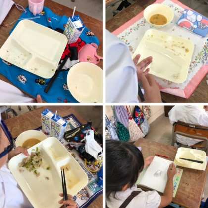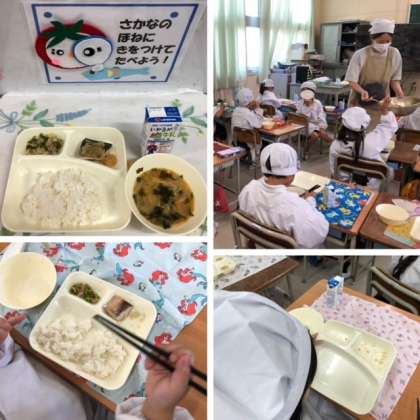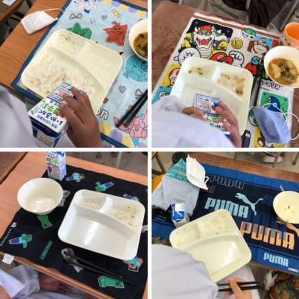 6月最終日の今日は、魚献立のさごしが出ました。1年生にとっては、今までで一番小骨がある魚メニューなので、上手に食べることができるかなと思って教室をのぞいてみました。「私、魚好きなの。家でもよく食べてるよ。」「魚、骨がいっぱいやった。」「骨が小さすぎるわ。」「1(13時5分)のところには食べ終わってたよ。」「おかわりした!!」など、いろいろな感想が聞かれました。ほとんどの1年生がおはしを上手に使って小骨をとり、しっかりとさごしを食べていました。食べ終わった人は、今日も食後の時間に本を読んだり、絵を描いたりしてゆっくりと過ごしていました。
