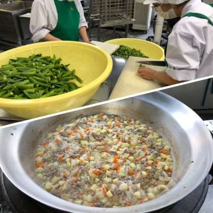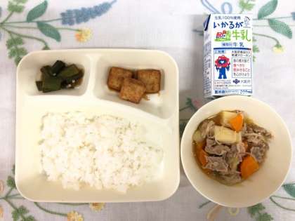 今日から7月の給食が始まりました。赤みそで味つけしたみそ肉じゃがや夏が旬のオクラのおかかいためなど、野菜がたくさん使われた献立でした。全体のできあがり量も多かったですが、どの学年の児童もしっかり食べて、学校全体でほとんど残食がありませんでした。1年生は、朝からのプールでおなかがすいて、3時間目ぐらいには「おなかすいたー!!」と言っていたそうです。そして、給食をもりもり食べていました。3年生は、「肉じゃがが好きやねん。」「おかわりにいっぱい並んでたよ。」「おかわりがほしかったけど、もう残ってなかった。」「オクラがおいしかった。」などの感想を伝えてくれました。