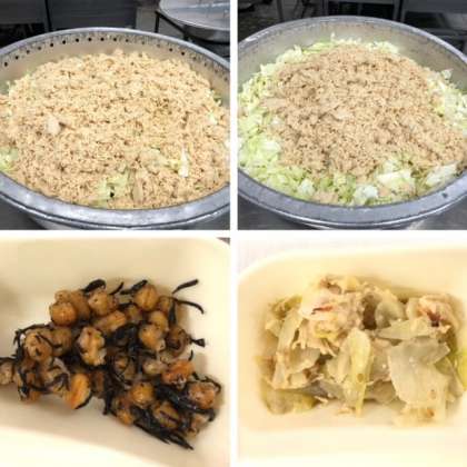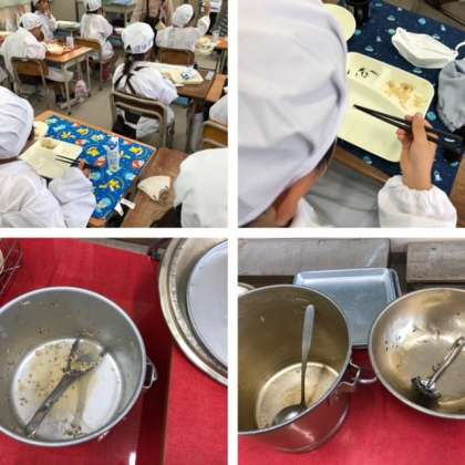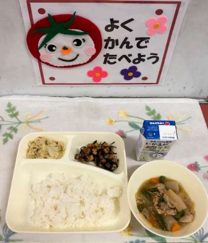 ひじき豆は、かみごたえのある『かみかみメニュー』でした。1年生もお箸を上手に使って、大豆を1粒ずつ食べていました。ごまみそ焼きは、ささみとキャベツ、ねりごま、砂糖、うすくちしょうゆ、白みそを混ぜ合わせ、焼き物機で蒸し焼きにしています。今日の給食について児童に聞いてみると、「ひじき豆がめっちゃおいしかった。」「どのおかずもごはんによく合っていて、ごはんと交互に食べた。」という感想がありました。かみかみメニューなので、食べ終わるまでに時間がかかりましたが、どの学級も最後までよくかんで食べていました。