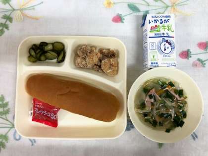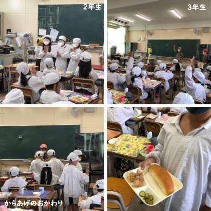 今日は、みんな大好き『鶏肉のからあげ』でした。たっぷりの油で、外はカラット、中はジューシーなからあげを作っています。中華スープには、今が旬のとうがんが入っていました。岡山県産のとうがんが納品されました。3年生の教室では、いろいろな国に親しもうということで、「いただきます」の挨拶を韓国語でしていました。みんなでとても上手に「チャル モッケ スムニダ」と言っていました。先生からの「からあげのおかわりいる人?」という声かけに、何人もの児童が手をあげていました。