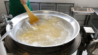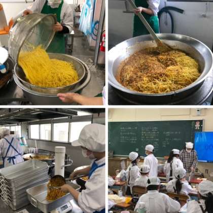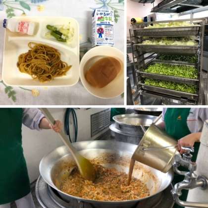 カレースパゲッティは、カレー粉やカレールウの素(米粉)で味つけしたソースの中に塩ゆでしたスパゲッティを入れていためています。サラダは、佐賀県産のグリーンアスパラガスとキャベツを焼き物機で蒸して、手作りのドレッシングをかけています。発酵乳は、児童に大人気でした。「今日の小さい飲み物、おいしかった!!」と喜んでいました。
