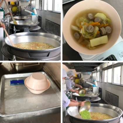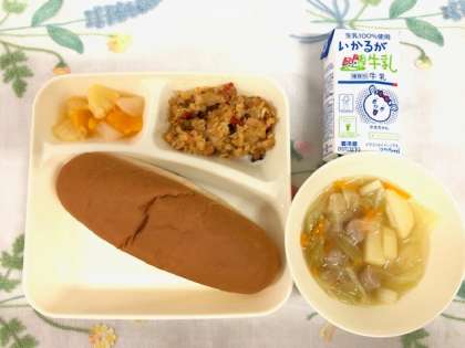 押麦のチキンパエリアは、新メニューでした。食物繊維の多い押麦を使い、宮崎県産の赤ピーマンも入っていました。スープは、むきえだまめの除去食でした。むきえだまめを加える前に除去食分を取り除き、ピンクのお椀に入れて食札をつけて提供しています。デザートのミックスフルーツ(缶)も含めてどのメニューも好評で、よく食べていました。