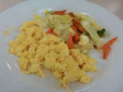 朝食に合うおかず作りで『三色野菜の油いため』『スクランブルエッグ』を作りました。