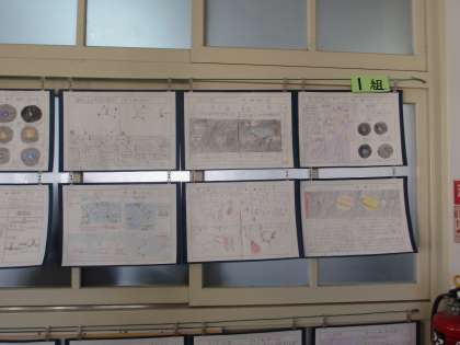 理科室前に全クラスの理科新聞を掲示しています。
