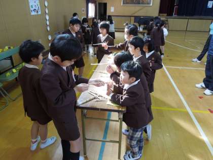 2月2日(木)に1年生を招待して、おもちゃまつりをしました。しゃてきや魚つり、ボーリングなど、自分たちで作ったおもちゃを1年生に楽しんでもらいました。やさしく教える姿は、すっかりお兄さんお姉さんで頼もしく感じました。
