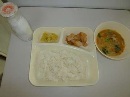 今日の献立は鶏肉の甘辛やき、みそ汁、キャベツの梅風味、ごはん、牛乳でした。