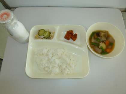 今日の献立はまぐろのオーロラ煮、じゃがいもと野菜の含め煮、きゅうりともやしのゆずの香あえ、ごはん、牛乳でした。