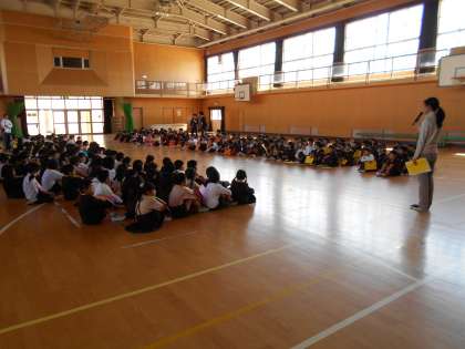 今日は、学校たんけんがありました。講堂に集合してから、2年生に学校の色々な場所を案内してもらいました。各教室で2年生のお姉さん、お兄さんに説明をしてもらい、1年生はとてもうれしそうでした。