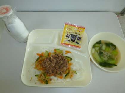 今日の献立はビビンバ、トック、いり黒豆、ごはん、牛乳でした。