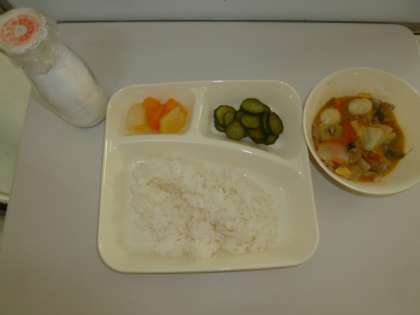 今日の献立は八宝菜、きゅうりの中華あえ、ミックスフルーツ(缶)、ごはん、牛乳でした。