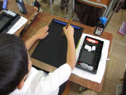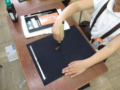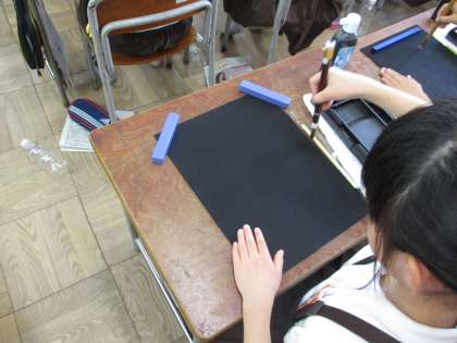 習字がスタートしました。初めての習字は、道具を置く場所や名前を覚えました。