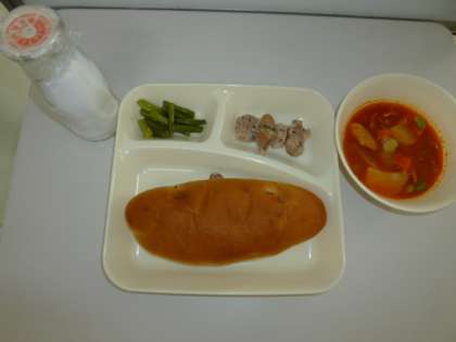 今日の献立は鶏肉のバジル焼き、ケチャップ煮、三度豆のソテー、レーズンパン、牛乳でした。