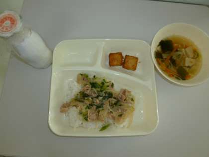 今日の献立は豚丼、五目汁、あつあげのじょうがじょうゆかけ、牛乳でした。