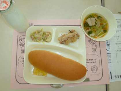 今日の献立は金時豆の中華おこわ、中華スープ、ツナと野菜のオイスターソースいため、コッペパン、マーマレード、牛乳でした。
