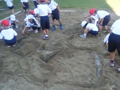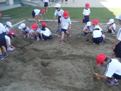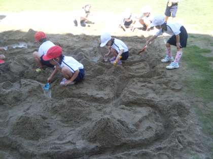 最後には、クラスのみんなで砂場いっぱいにつなげて「大きな町みたいなのができた。」「楽しい。」と大満足で活動が終了しました。