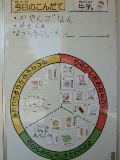給食委員の児童が毎日献立を書き換えて、食材カードを黄・赤・緑に分けて貼ってくれています。