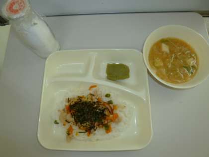 今日の献立はかやくごはん、みそ汁、抹茶ういろう、牛乳でした。